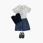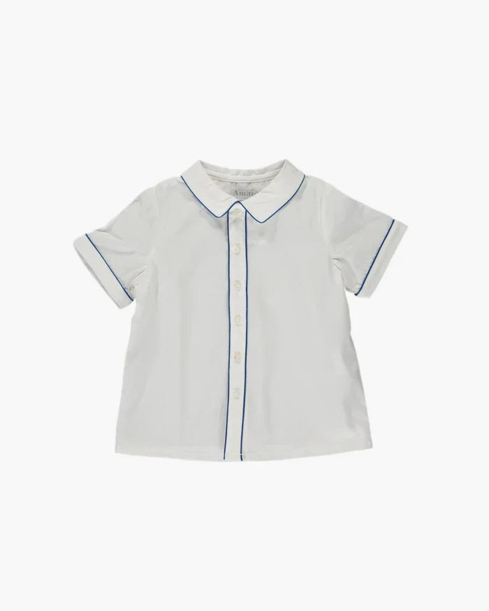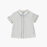 A classic summer staple for the little boys crafted from soft poplin cotton in white with contrasting mid-blue piping on its sleeves, collar and along the front. Delicate mother of pearl buttons fasten down this piece, adding a special touch to keep your little boy stylish, comfortable and cool throughout the warmer months ahead. Timeless, yet boyishly fun, this is an easy and versatile style. We love it together paired with Gull Shorts and our classic boys' T-bar shoes for polished little boys' look.