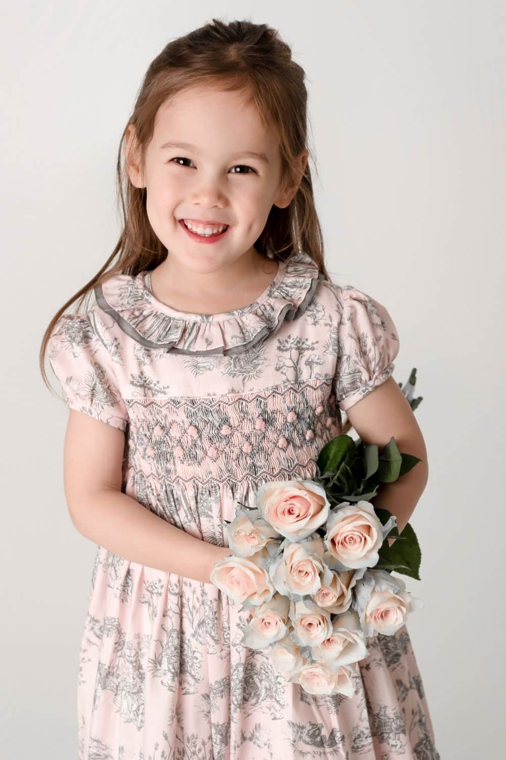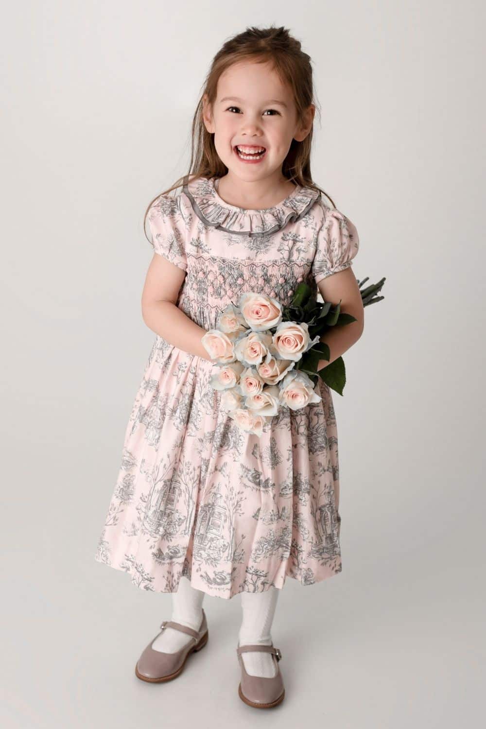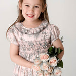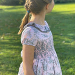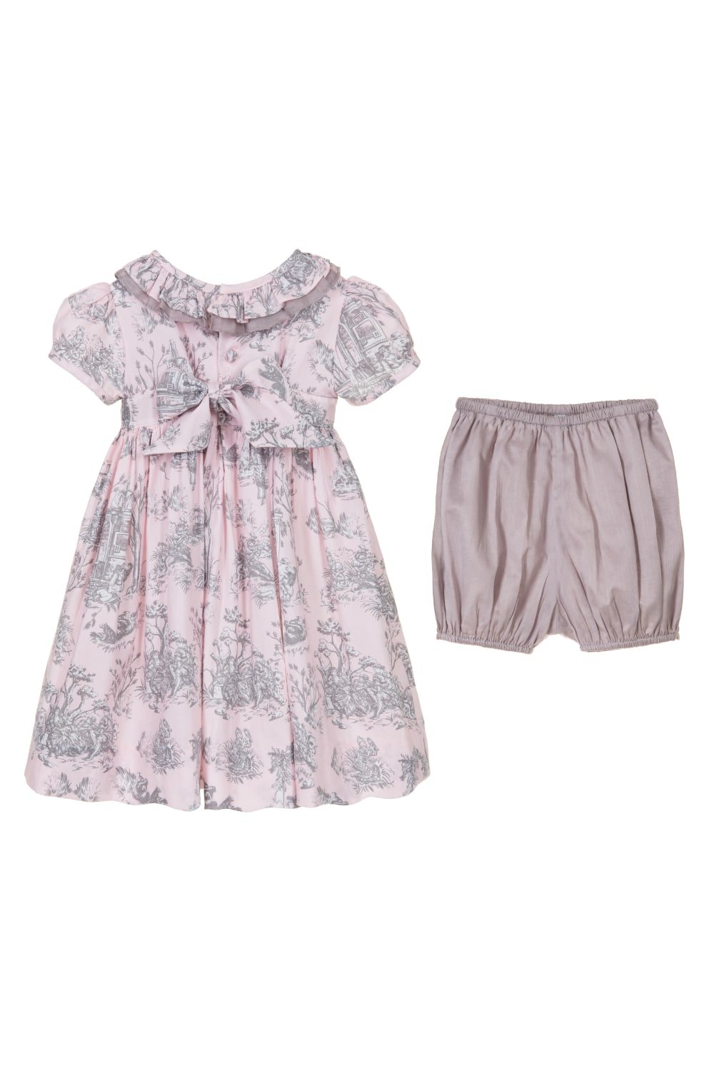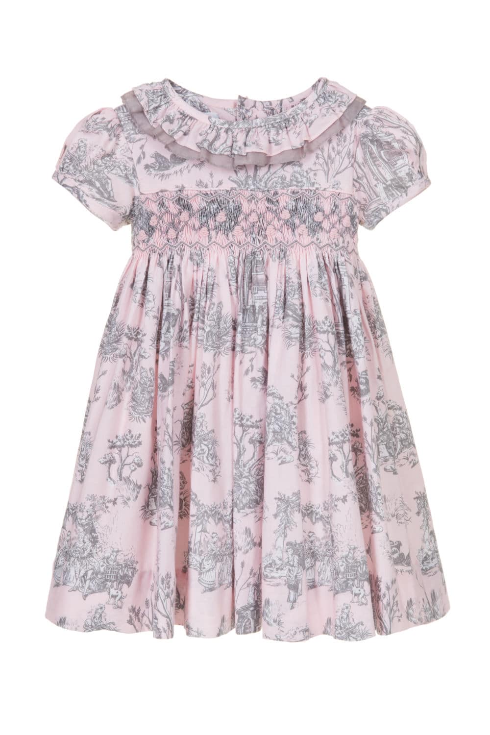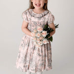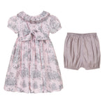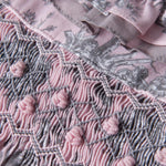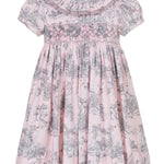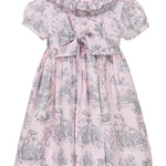A contemporary take on a traditional design, Annafie¡¦s new striking colour combination of soft pink and grey puts a stylish twist on the classic Toile de Jouy. With its delicate pierrot collar in sheer grey cotton voile and lightly puffed sleeves, this dress is reminiscent of classic, Georgian styles.