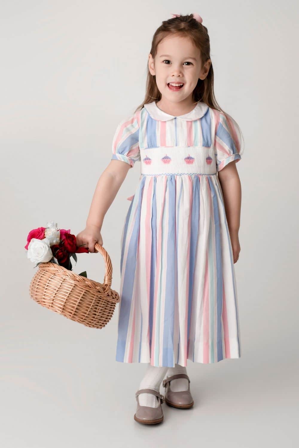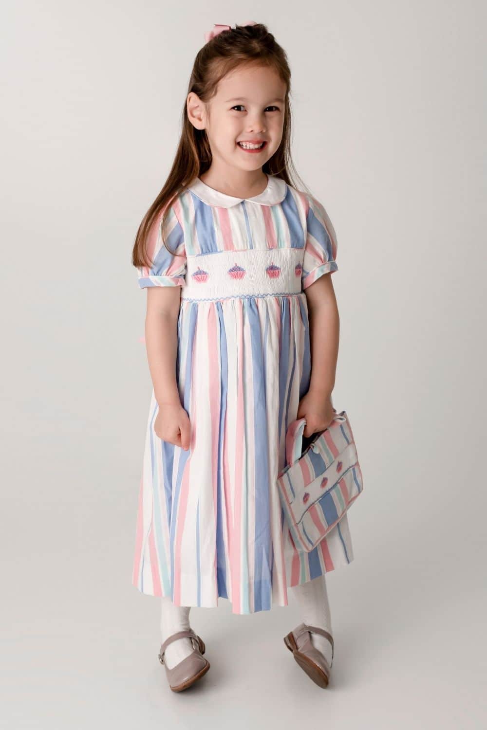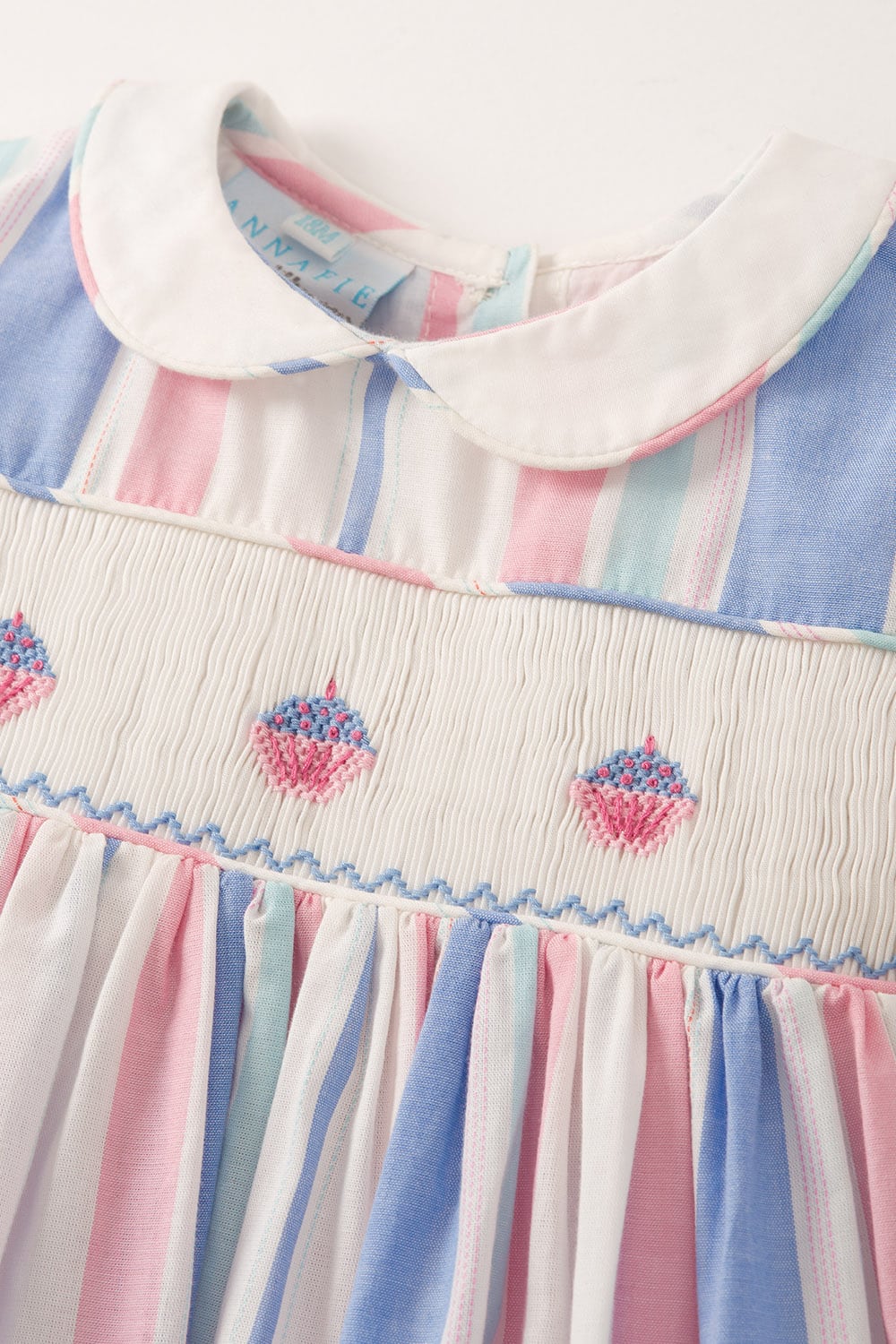 Featuring exquisitely hand-embroidered cupcakes and smocking, this dress is perfect for any little one that has a big sweet tooth. The delicate puffed sleeves and classic white peter pan collar lend the dress our signature Annafie silhouette, ensuring your little one looks effortlessly stylish and sophisticated. Don¡¦t forget to complete the look with the matching Cupcake bag.