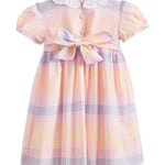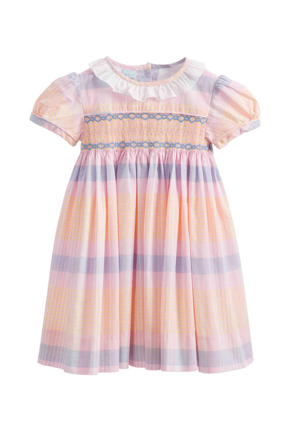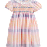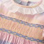 Featuring delightful pastel stripes, the Joy dress boasts a classic Annafie silhouette, complete with delicate puffed cap sleeves and a frilled collar in white. The hand-smocked chest and hand-embroidered detailing add a touch of sophistication to the design, giving it a beautiful finish that¡¦s perfect for any special occasion