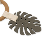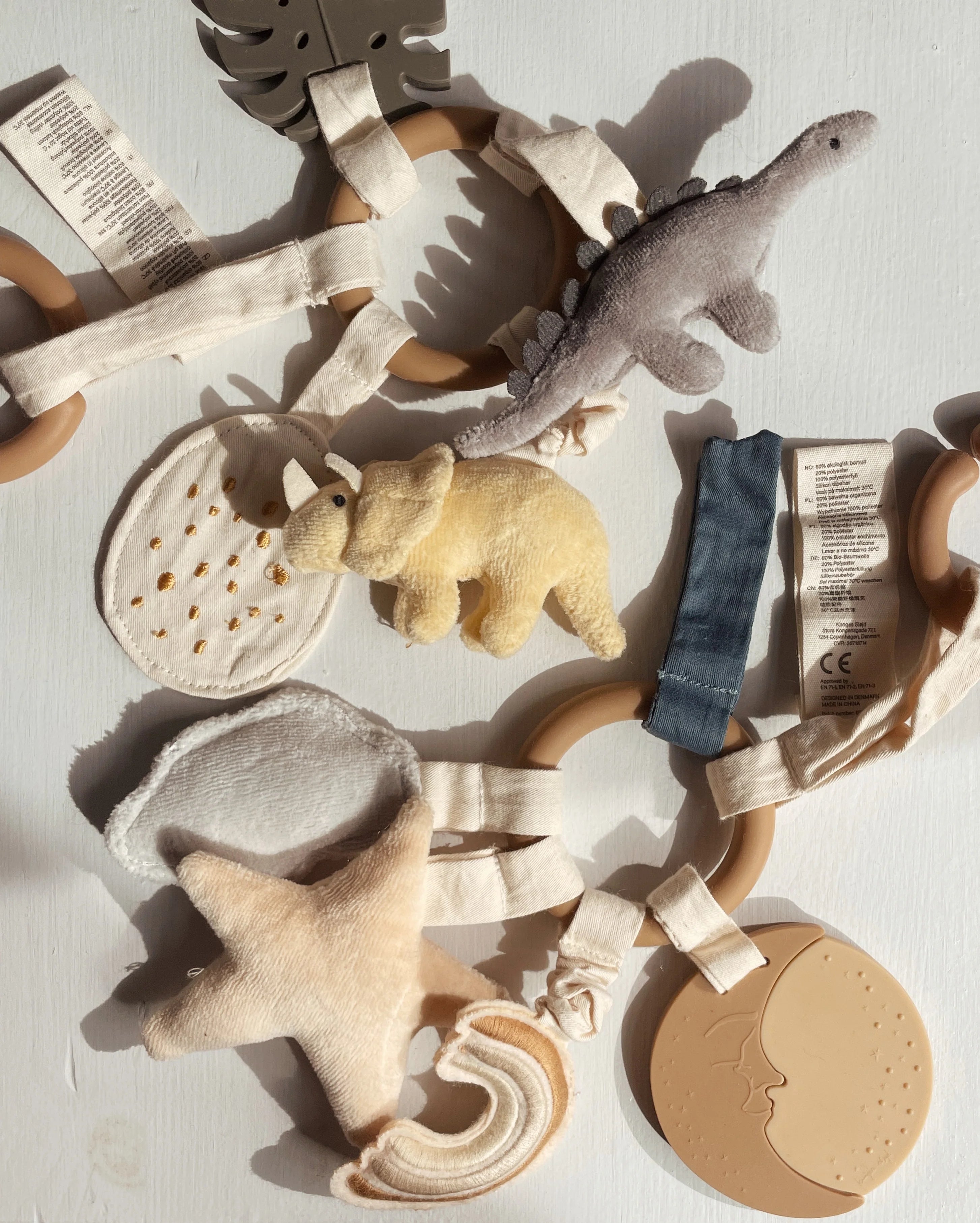 There is a wooden ring with a bunch of things attached to: a little squishy chewing leaf, tags to play with, a soft mirror with an embroidery patterned dinosaur surface on the back, a tiny dinosaur with a bell inside that rings when shaken and a dinosaur with a crispy belly when touched - all to stimulate your baby's senses