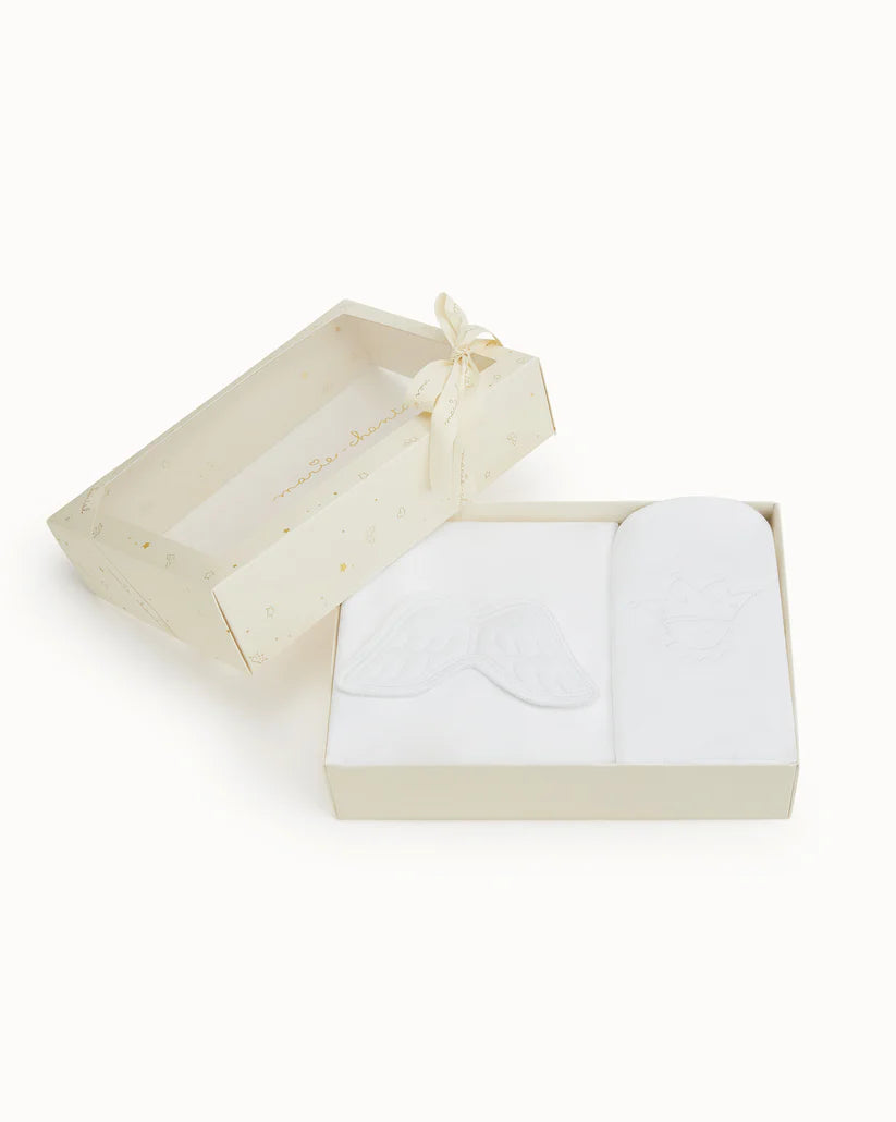This Angel Wing? Bath Time Gift Set is the ideal set for a newborn baby's delicate skin. Including an adorable White hooded towel with our signature Angel Wing? and a matching bath Mitten, this set is presented in our exclusive Marie-Chantal gift box, ready for gifting.