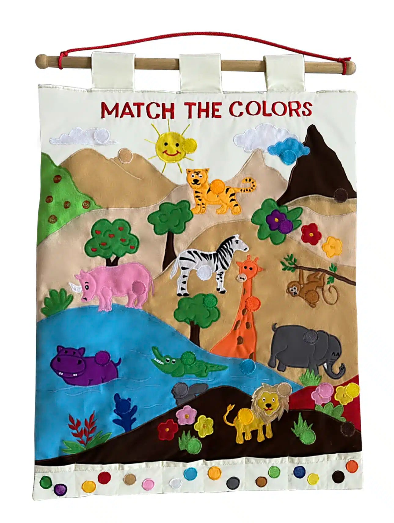 Our Match The Colors chart is a beautifully embroidered wall chart designed to captivate your child’s imagination while fostering essential learning skills. The chart is a delightful and educational tool which combines the joy of exploring various animals with the excitement of identifying and matching colors, resulting in an engaging and enriching experience for young minds.