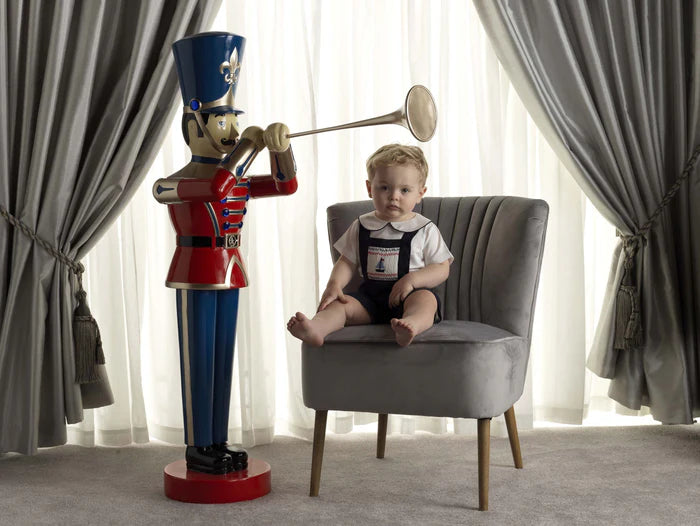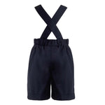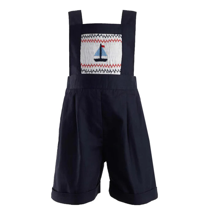 Bestseller! Classic tailored dungarees in navy cotton, with a sailboat hand smocked design on the front panel, turn-ups, an elasticated back waist and adjustable straps which cross over at the back with choice of two button fastenings, fully lined in cotton.