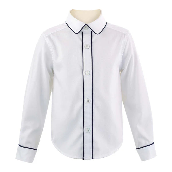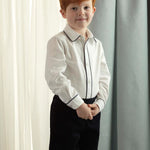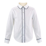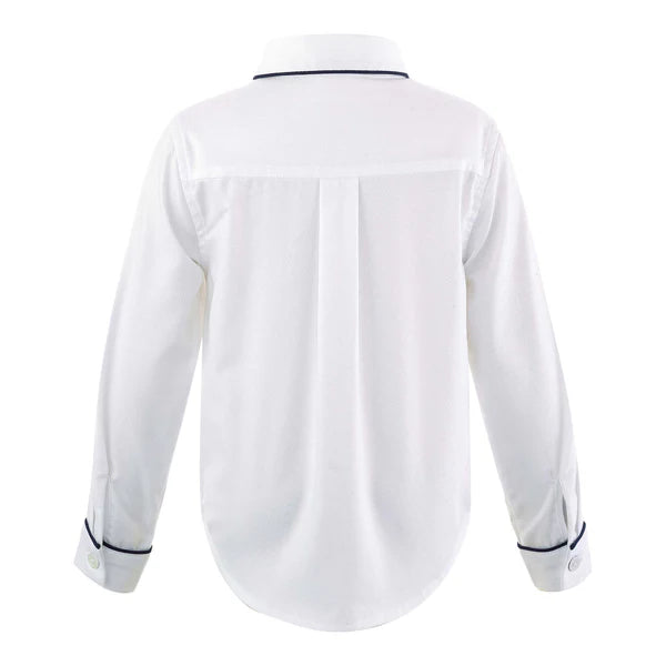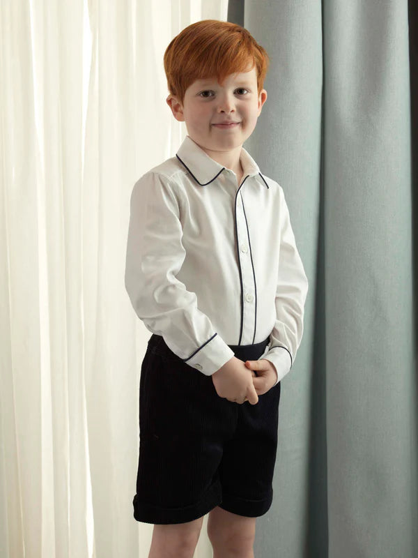 Formal shirt in premium ivory pique cotton trimmed with a contrasting navy piping at the collar edge, cuffs and button placket. Team with a pair of shorts or corduroy trousers from our collection for the perfect outfit, or layer up with one of our cosy knitwear pieces. Also available with a blue or red trim. Coordinating item available for baby boys.