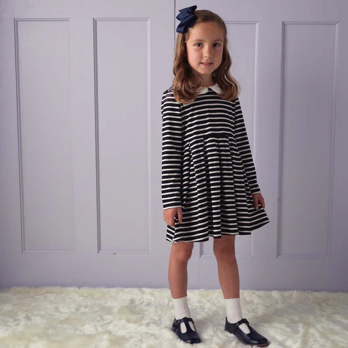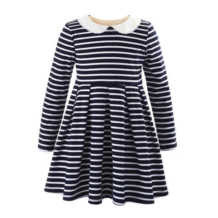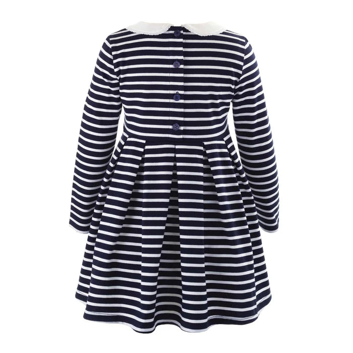 A versatile long sleeve dress, essential to any little girl¡¦s winter wardrobe, in soft jersey with a classic navy and ivory breton stripe. The contrast collar with lace trimmed edge adds a little something special to this comfy day dress. Layer up with one of our soft?cardigans?on cooler days. Matching dress available for?baby girls.?Style available in a selection of designs. Also available in pink.