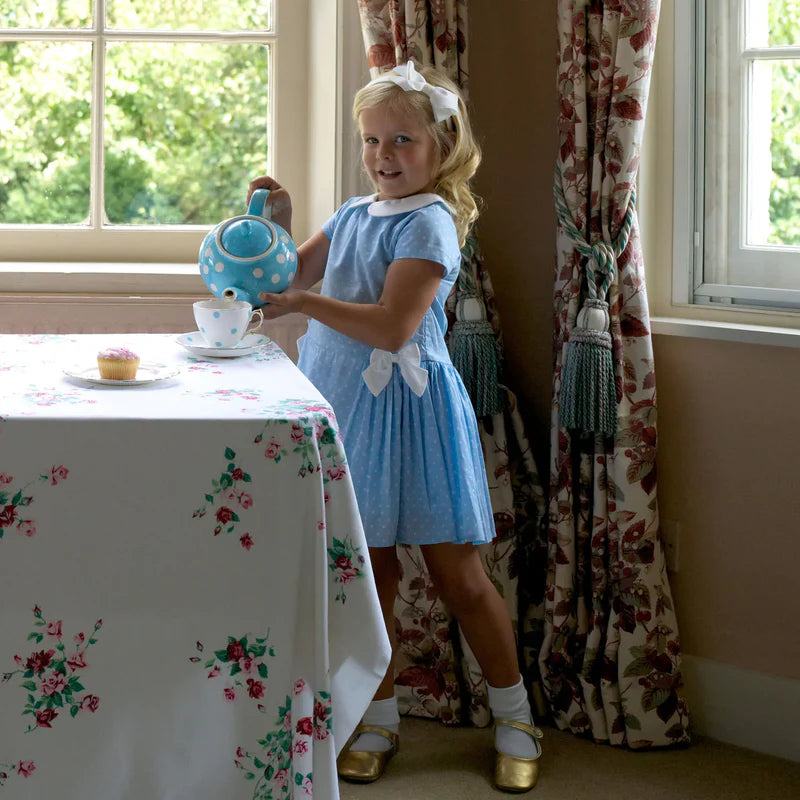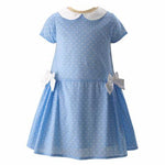 New! This Starburst Bow Dot Dress is the perfect combination of style and fun for kids. Its A-line silhouette features a scattered ivory star print on a soft blue base, and is finished with a contrasting ivory peter pan collar and ivory bows on a gathered skirt. With a convenient zip closure at the back, this dress adds both practicality and charm.