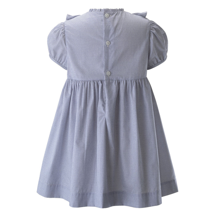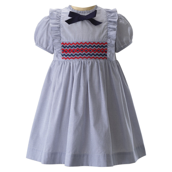 Step up her style with our expertly crafted Pindot Smocked Dress. Made of lightweight ivory cotton with a delicate navy pindot pattern, this dress boasts feminine frills and intricate geometric embroidery on the chest. The finishing touch? A navy bow at the neckline. Simply beautiful!