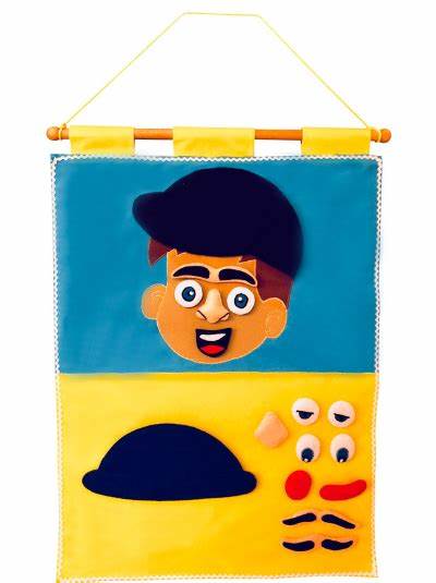 Our Boy Face Chart is a beautifully embroidered interactive wall chart that makes learning facial parts, facial expressions as well as exploring feelings and emotions fun! It also allows parents to work on stimulating speech, fine motor skills, and object identification. Children can create different facial expressions on the face with the facial parts that come with the chart as well as add different accessories.